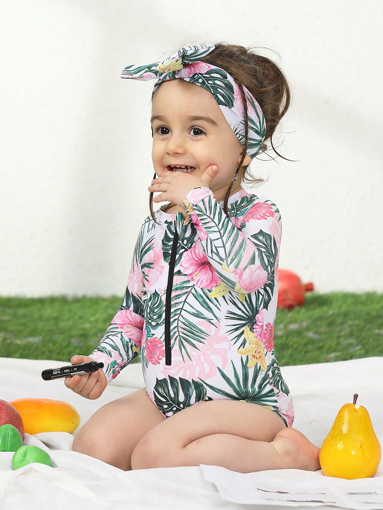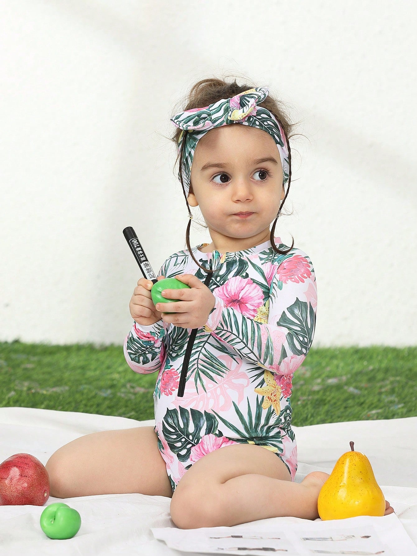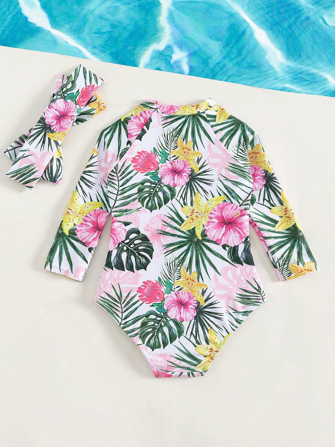 Maiô feminino para Bebê Com Estampa Tropical E Faixa Para Cabeça Natasha